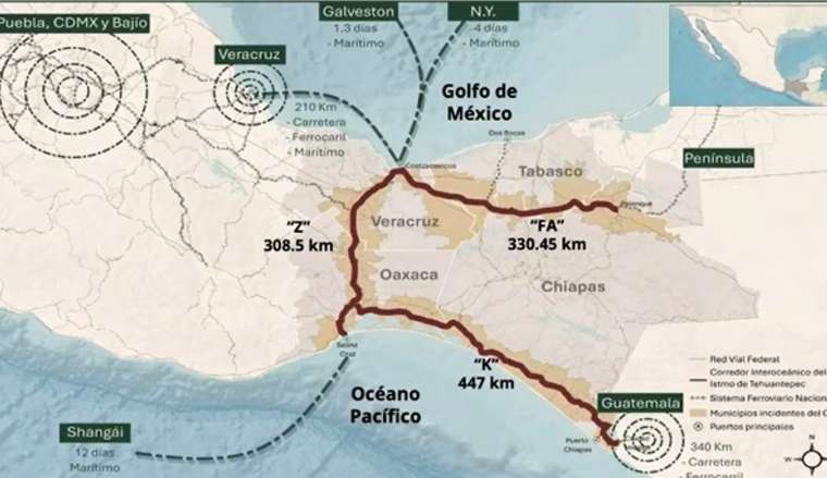 El texto detalla el proyecto para establecer una plataforma logística multimodal que integre los puertos del Pacífico y del Golfo de México -Coatzacoalcos, Salina Cruz, Dos Bocas y Puerto Chiapas-, conectados mediante infraestructura ferroviaria y carretera.