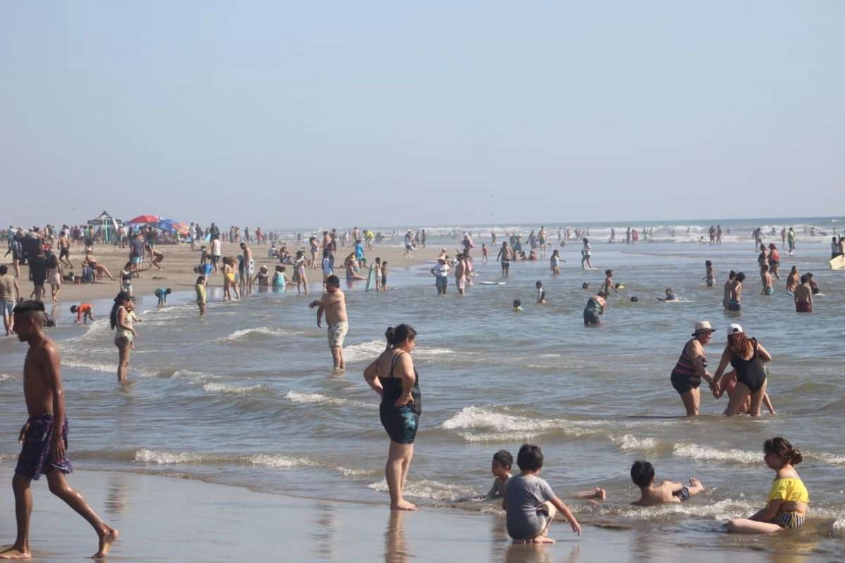 El oleaje se mantiene tranquilo incluso para los adultos mayores, mientras las familias juegan en la orilla del mar.